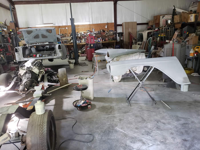 As you can see the car is now in the paint shop and the painter is re-doing much of my labors. He is very particular and that is a good thing. You won't find many dents in the exterior metal, most is new. The original paint color was Glacier Blue and Shoreline Beige and I decided to darken the blue and add a small amount of pearl to the white just to be different.